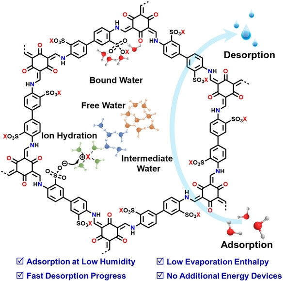 Abstract:Herein, we introduce a series of ionic covalent organic frameworks (iCOFs) with a focus on addressing the challenge of water collection at low relative humidity levels below 25 %. These iCOFs are characterized by numerous hydrophilic sites and high water stability, enabling efficient water vapor adsorption even at relatively low humidity levels. Through the use of various hygroscopic salt cations and precise control of ion concentration within the pores, the water state within the iCOFs pores can be effectively managed. Among the iCOFs, TB-COF-Li stands out with an impressive adsorption capacity of 0.24 g g−1 from 0 to 22 % RH. Notably, due to its ionic porous structure, TB-COF-Li exhibits a significantly lower enthalpy of evaporation, measured at 967.04 J g−1, compared to bulk water with an enthalpy of 2387.40 J g−1. Moreover, under simulated conditions of 1.5 solar intensity at 60 °C, the majority of the adsorbed water can be rapidly desorbed without the need for additional energy input. This efficient desorption process contributes to a high water collection rate of 0.092 g g−1 h−1 in the final atmospheric water harvesting device. The development of these iCOFs offers a promising and cost-effective solution for obtaining fresh water in arid regions.