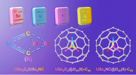 The chemistry of f-block metal–carbon multiple bonds is underdeveloped compared to well-established carbene complexes of the d-block transition metals. Herein, we report two new actinide-rare earth mixed metal carbides and nitrogen carbide cluster fullerenes, USc2C2@D5h(6)-C80 and USc2NC@D5h(6)-C80, which contain U–C bonds with triple bond character and were successfully synthesized and characterized by mass spectrometry, UV–vis–NIR spectroscopy, Fourier transform infrared spectroscopy, single crystal X-ray diffraction, and DFT calculations. Crystallographic studies show that the two previously unreported clusters, USc2C2 and USc2NC, are stabilized in the D5h(6)-C80 carbon cage and adopt unique trifoliate configurations, in which C2/NC units are almost vertically inserted into the plane defined by the U and two Sc atoms. Combined experimental and theoretical studies further reveal the bonding structure of USc2C2 and USc2NC, which contain C═U(VI)═C and C═U(V)═N bonding motifs. The electronic structures of the two compounds are determined as U6+(Sc2)6+(C4–)2@D5h(6)-C804– and U5+(Sc2)6+(N)3–(C)4–@D5h(6)-C804–, respectively. Quantum-chemical studies confirm that the U–C bonds in both molecules show unprecedented multicenter triple-bond character. The discovery of this unique U–C multiple bond offers a deeper understanding of the fundamentals of uranium chemistry.