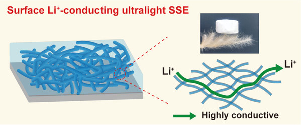 Abstract: Bulk Li+-conducting lithium superionic conductors are susceptible to disruption by grain boundaries and interparticle porosity, necessitating high densification and consequently limiting the gravimetric energy density of solid-state batteries. Here, we discovered a new class of surface-conducting lithium superionic conductors achieved through surface chemisorption. After bonding with ligands, surface atoms of inert substrates become binding sites for lithium salt dissociation and hopping sites for fast surface Li+ diffusion, transforming inert materials into surface-conducting Li+ conductors. Using two-dimensional TiO2 nanosheets as a proof of concept, we show that ethylene glycolate-chemisorbed TiO2 significantly enhances lithium salt dissociation and promotes fast Li+ hopping between surface oxygen atoms, achieving a high surface ion mobility of 3.61 × 10–7 cm2·V–1·s–1─an improvement of 600% over the bulk Li+ mobility of Li7La3Zr2O12 solid oxide electrolytes. Benefiting from surface Li+ conduction, an ultralight oxide aerogel solid-state electrolyte was developed with an unprecedented low density of 0.29 g·cm–3, which is only 25% of that of liquid electrolytes and 5.7% of garnet-type solid electrolytes. A LiFePO4-based solid-state battery utilizing this new electrolyte exhibits a significantly high energy density of ∼295 Wh·kg–1, achieving 160% of that of a Li7La3Zr2O12-based solid-state battery even with the same electrolyte thickness. Furthermore, this guideline for designing surface-conducting superionic conductors is generalizable and can be extended to diverse cations and substrates, promising lightweight, highly conductive solid-state electrolytes with broad implications beyond solid-state batteries.