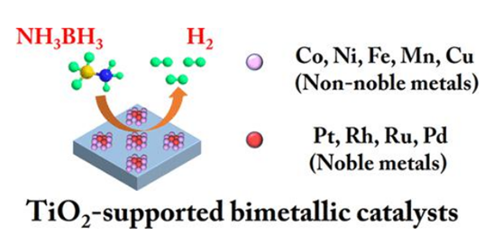 Ammonia borane (AB) has been regarded as a promising material for chemical hydrogen storage. However, the development of efficient, cost-effective, and stable catalysts for H2 generation from AB hydrolysis remains a bottleneck for realizing its practical application. Herein, a step-by-step reduction strategy has been developed to synthesize a series of bimetallic species with small sizes and high dispersions onto various metal oxide supports. Superior to other non-noble metal species, the introduction of Co species can remarkably and universally promote the catalytic activity of various noble metals (e.g., Pt, Rh, Ru, and Pd) in AB hydrolysis reactions. The optimized Pt0.1%Co3%/TiO2 catalyst exhibits a superhigh H2 generation rate from AB hydrolysis, showing a turnover frequency (TOF) value of 2250 molH2 molPt–1 min–1 at 298 K. Such a TOF value is about 10 and 15 times higher than that of the monometal Pt/TiO2 and commercial Pt/C catalysts, respectively. The density functional theory (DFT) calculation reveals that the synergy between Pt and CoO species can remarkably promote the chemisorption and dissociation of water molecules, accelerating the H2 evolution from AB hydrolysis. Significantly, the representative Pt0.25%Co3%/TiO2 catalyst exhibits excellent stability, achieving a record-high turnover number of up to 215,236 at room temperature. The excellent catalytic performance, superior stability, and low cost of the designed catalysts create new prospects for their practical application in chemical hydrogen storage.