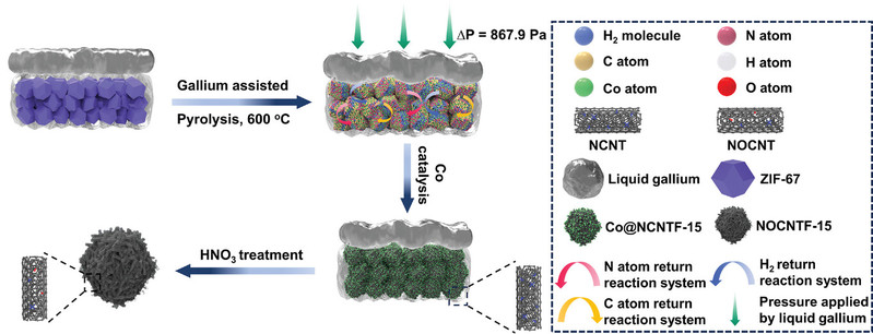 Abstract: Carbon materials have great potential for applications in energy, biology, and environment due to their excellent chemical and physical properties. Their preparation by carbonization methods encounters limitations and the carbon loss during pyrolysis in the form of gaseous molecules results in low yield of carbon materials. Herein a low-energy (600 °C) and high-yield (82 wt.%) carbonization strategy is developed using liquid gallium-assisted pyrolysis of metal-organic frameworks (MOFs) affording the N-doped carbon nanotube (CNT) non-hollow frameworks encapsulating Co nanoparticles. The liquid gallium layer offers protection against air, promotes heat transfer, and limits the escape of small carbonaceous gaseous molecules, which greatly improve the yields of the pyrolysis reaction. Experimental and theoretical results reveal that the synergistic interaction between CNTs and N/O-containing groups gives a non-hollow framework composed of N/O-enriched and open CNTs (NOCNTF-15, 15 denotes the 15 mm thickness of the liquid gallium layer during the pyrolysis) with high specific capacity (185 mAh g−1 at 10 A g−1) and ultra-stable cyclability (stable operation at 10 A g−1 and 50 °C for 20 000 cycles). This study provides a unique approach to carbonization that facilitates the practical application of low-cost CNTs and other MOFs-derived carbon materials in high-performance sodium-ion batteries (SIBs).