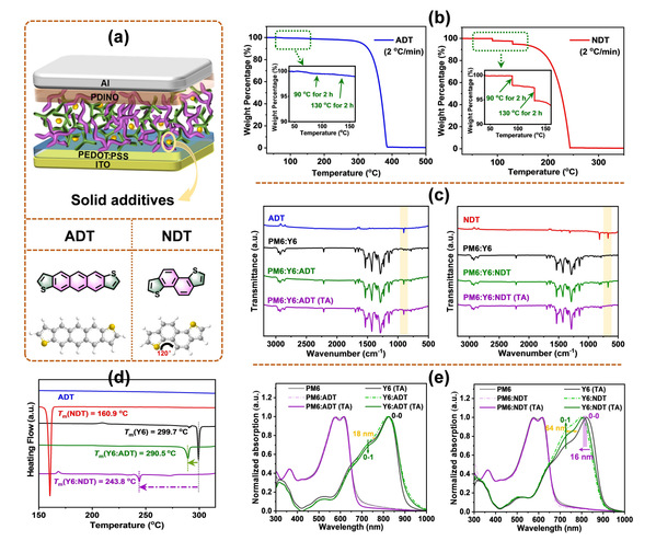 Abstract:Regulating molecular packing and aggregation of photoactive layer is a critical but challenging issue in developing high-performance organic solar cells. Herein, two structurally similar analogues of anthra [2,3-b:6,7-b´] dithiophene (ADT) and naphtho[1,2-b: 5,6-b´]dithiophene (NDT) are developed as solid additive to exploit their effect in regulating the molecular aggregation and & pi;-stacking of photoactive layer. We clarify that the perpendicular arrangements of NDT can enlarge the molecular packing space and improve the face-on stacking of Y6 during the film formation, favoring a more compact and ordered long-range π-π stacking in the out-of-plane direction after the removal of NDT under thermal annealing. The edge-to-face stacked herringbone-arrangement of ADT along with its non-volatilization under thermal annealing can induce the coexistence of face-on and edge-on stacking of blend film. As a result, the NDT treatment shows encouraging effect in improving the photovoltaic performance of devices based on various systems. Particularly, a remarkable PCE of 18.85 % is achieved in the PM6 : L8-BO-based device treated by NDT additive, which is a significant improvement with regard to the PCE of 16.41 % for the control device. This work offers a promising strategy to regulate the molecular packing and aggregation of photoactive layer towards significantly improved performance and stability of organic solar cells.