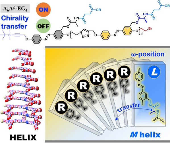 Abstract: Discrete oligomers can be used to precisely evaluate the structure–property relationship and enable unique chiroptical activities, however, the role of stereochemical sequences on chirality transfer is still unclear. Herein, we report the successful synthesis of a series of sequence-defined chiral azobenzene (Azo) oligomers via iterative stepwise chain growth strategy. Sequence-defined stereoisomers with one single chiral (L or D) stereocenter at the α-position, ω-position and middle- (m−) position have completely different self-assembly dynamics. ω-positional stereocenter can effectively command all Azo building blocks to adopt a tilted π–π stacking along the helical superbundles, exhibiting the activation of chirality transfer. However, discrete oligomers with the stereocenter at other positions can only self-assemble into non-helical nanowires, accompanied by the deactivation of chirality transfer.Cooperative supramolecular interactions, including the π–π interaction between Azo units, the intermolecular hydrogen bonding and steric hindrance, are intrinsic driving forces for these differentiations.