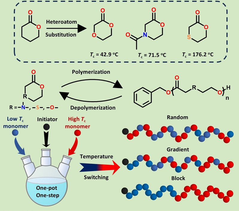 Abstract: In this paper, we proposed a heteroatom substitution strategy (HSS) in the δ-valerolactone (VL) system to modulate thermodynamics toward chemically recyclable polyesters. Three VL-based monomers containing different heteroatoms (M1 (N), M2 (S), and M3 (O)), instead of C-5 carbon, were designed and synthesized to verify our proposed HSS. All three monomers undergo organocatalytic living/controlled ROP and controllable depolymerization. Impressively, the resulting P(M1) achieved over 99 % monomer recovery under both mild solution depolymerization and high vacuum pyrolysis conditions without any side reactions, and the recycled monomers can be polymerized again forming new polymers. The systematic study of the relationship between heteroatom substitution and recyclability shows that introducing heteroatoms does change the thermodynamics of the monomers (ΔHpo, ΔSpo and Tc values), thereby adjusting the polymerizability and depolymerizability. DFT calculations found that the introduction of heteroatoms adjusts the ring strain by changing the angular strain of the monomers, and the order of their angular strain (M2>M1>M3) is consistent with the order of the experimentally obtained enthalpy change. Notably, the one-pot/one-step copolymerization of two of each of the three monomers enables the synthesis of sequence-controlled copolymers from gradient to random to block structures, by simply switching the copolymerization temperature.