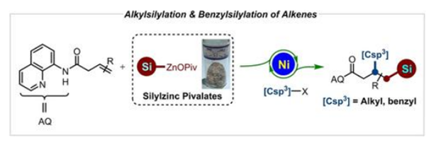 We herein report the preparation of solid and salt-stabilized silylzinc pivalates from the corresponding silyllithium reagents via transmetalation with Zn(OPiv)(2). These resulting organosilylzinc pivalates show enhanced air and moisture stability and unique reactivity in the silylative difunctionalization of alkenes. Thus, a practical chelation-assisted nickel-catalyzed regioselective alkyl and benzylsilylation of alkenes has been developed, which provides an easy method to access alkyl silanes with broad substrate scope and wide functional group compatibility. Kinetic experiments highlight that the OPiv-coordination is crucial to improve the reactivity of silylzinc pivalates. Furthermore, late-stage functionalizations of druglike molecules and versatile modifications of the products illustrate the synthetical utility of this protocol.