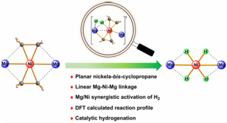The nature of transition-metal–olefin bonding has been explained by the Dewar–Chatt–Duncanson model within a continuum of two extremes, namely, a π-complex and a metallacyclopropane. The textbook rule suggests that a low-spin late-transition-metal–ethylene complex more likely forms a π-complex rather than a metallacyclopropane. Herein, we report a low-spin late-transition-metal–bis-ethylene complex forming an unprecedented planar metalla-bis-cyclopropane structure with magnesium-based metalloligands. Treatment of LMgEt (L = [(DippNCMe)2CH]−, Dipp = 2,6-iPr2C6H3) with Ni(cod)2 (cod = 1,5-cyclooctadiene) formed the heterotrimetallic complex (LMg)2Ni(C2H4)2, which features a linear Mg–Ni–Mg linkage and a planar coordination geometry at the nickel center. Both structural features and computational studies strongly supported the Ni(C2H4)2 moiety as a nickelaspiropentane. The exposure of (LMg)2Ni(C2H4)2 to 1 bar H2 at room temperature produced a four-hydride-bridged complex (LMg)2Ni(μ-H)4. The profile of H2 activation was elucidated by density functional theory calculations, which indicated a novel Mg/Ni cooperative activation mechanism with no oxidation occurring at the metal center, differing from the prevailing mono-metal-based redox mechanism. Moreover, the heterotrimetallic complex (LMg)2Ni(C2H4)2 catalyzed the hydrogenation of a wide range of unsaturated substrates under mild conditions.