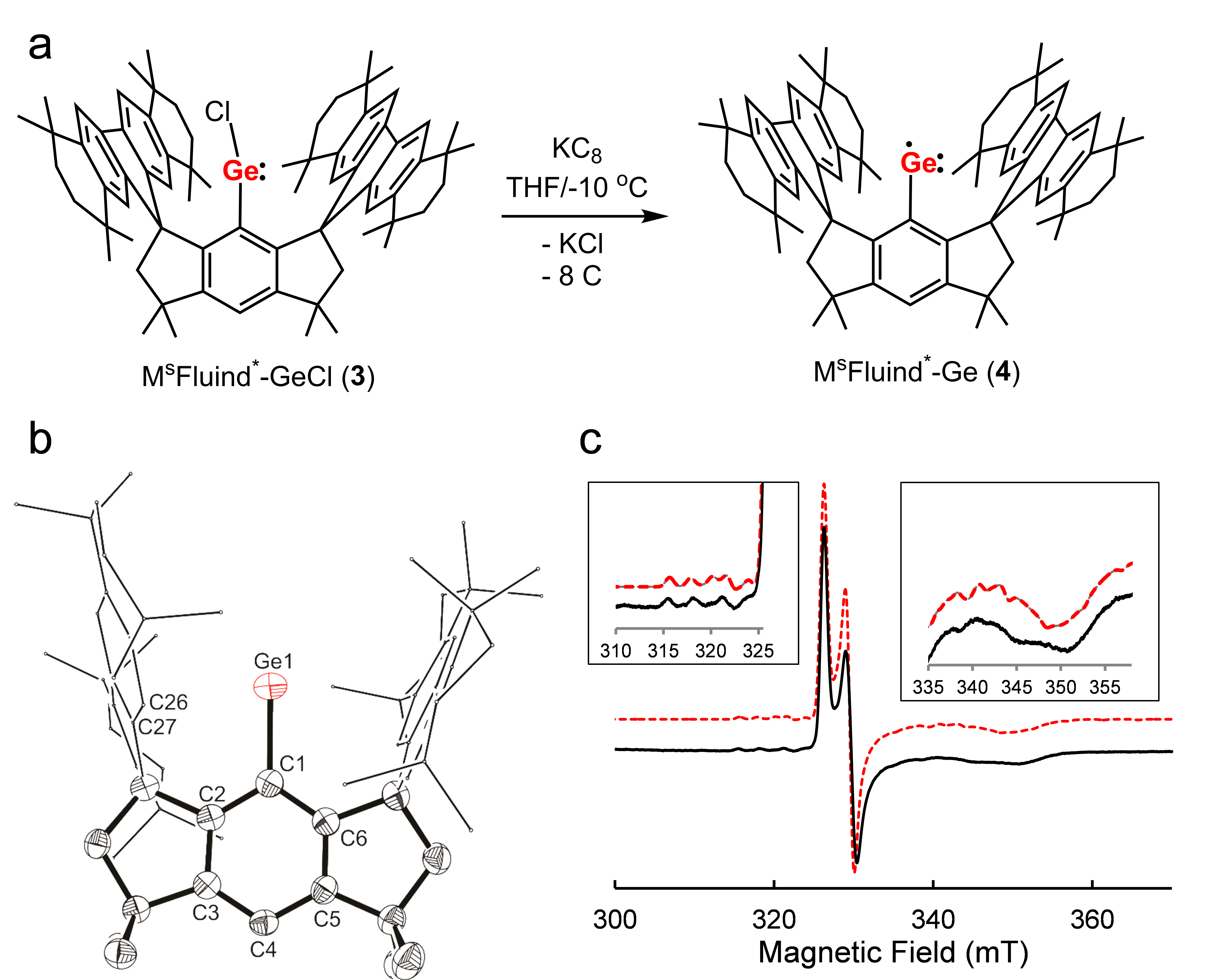 在前期的工作中,该课题组发展了一种两侧由芴基取代的大位阻芳基配体,利用该配体实现了Ge/P和Ge/As的有机腈类似物的合成与反应性研究(J. Am. Chem. Soc. 2022, 144, 5126)。在本工作中,作者利用该类型的大空间位阻芳基配体稳定了单取代一价中性锗卡拜化合物MsFluind*–Ge(4)。该化合物通过锗宾化合物MsFluind*–GeCl(3)与等当量KC8在–10 oC条件反应合成得到(上图a)。通过单晶X-射线衍射确定了化合物的分子结构(上图b)。电子顺磁共振(EPR)波谱分析说明化合物4中单电子也主要分布在锗原子上(上图c)。南京工业大学赵莉莉/Gernot Frenking教授团队通过量子化学理论计算对4的电子结构进行了深入研究。采用先进的能量分解分析方法研究发现除了锗中心和连接苯环的成键和π反馈作用外,锗中心和二侧的芴环取代基的色散力相互作用对化合物的稳定存在重要的贡献。该工作有助于人们理解卡拜及其类似物的结构和反应化学,为其他具有特殊电子结构的化合物的合成提供了一个新的配体体系。