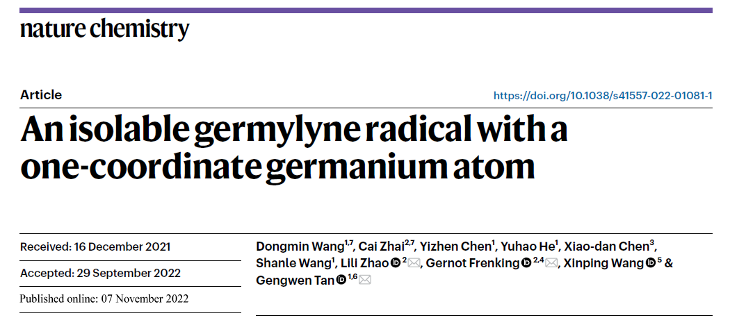 近日,Nature Chemistry在线发表了我校禁漫天堂 化学科学国际合作创新中心谭庚文教授课题组题为“An isolable germylyne radical with a one-coordinate germanium atom”的研究论文,论文通过他们课题组设计的大位阻芳基配体实现了首例单取代锗卡拜化合物的分离与表征。论文以苏州大学为第一及通讯署名单位发表。第一作者为苏州大学2022级博士研究生王东闽和南京工业大学硕士研究生翟彩。通讯作者为苏州大学谭庚文教授、南京工业大学赵莉莉教授和Gernot Frenking教授。南京大学王新平教授也为该项目的实施提供了大力支持。