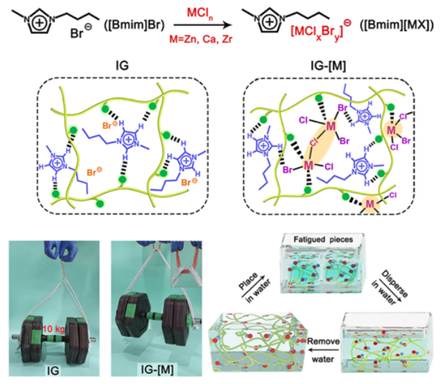 The mechanical properties of most hydrogels (ionogels) are considerably affected by covalently cross-linked networks. However, the interactions between solvent/solvent molecules and solvent/polymer chains are usually ignored. Herein, a series of ultra-tough ionogels were prepared via a supramolecular solvent, halometallate ionic liquid, in which cations and coordinating anions form a 3D supramolecular network. The linear polymer chains are physically cross-linked with supramolecular solvents synergistically enhancing the strength (14.3 MPa), toughness (78 MJ m−3), and Young's modulus (55 MPa) of ionogels, effectively dispersing the stress concentration under load, and obtaining better fatigue resistance and higher fracture energy (198 kJ m−2). Furthermore, the reversible cross-linking enables green recovery and recycling of ionogels, simply by water. This strategy shows broad applicability based on a variety of supramolecular solvents and coordinatable polymers.