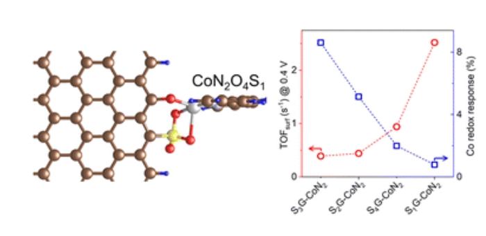 Abstract: Heterogeneous molecular catalysts (HMCs) with cobalt (Co) active sites are potent for the electrochemical oxygen evolution reaction (OER) in energy conversion applications. Such catalysts typically operate through the classical redox-mediated mechanism, where dynamic equilibria of Co2+/3+ and Co3+/4+ redox states are present before and throughout the OER cycle. However, the generation of low-valent Co2+ sites is disadvantageous for catalysis. To address this, sulfate groups embedded in graphene were developed to link a model Co-2,2′-bipyridine complex, resulting in the synthesis of a novel Co-based HMC that generates a specific CoN2O4S1 coordination moiety. These molecular Co sites were induced to oxidize from +2 to +3 oxidation state at open-circuit conditions, due to their proton-coupled electron transfer nature. This process ultimately eliminated the generation of the Co2+ state from its redox equilibrium and efficiently improved the turnover frequencies of Co sites toward OER, showing a two-order dependence on the concentrations of OH− ions. This work provides a novel mechanistic perspective for the rational design of high-performance HMCs.