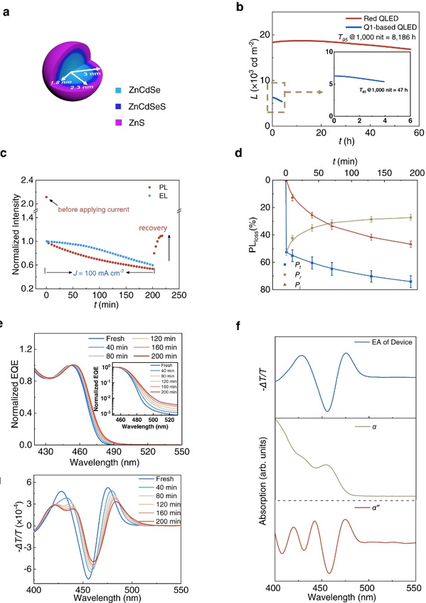Abstract:To industrialize printed full-color displays based on quantum-dot light-emitting diodes, one must explore the degradation mechanism and improve the operational stability of blue electroluminescence. Here, we report that although state-of-the-art blue quantum dots, with monotonically-graded core/shell/shell structures, feature near-unity photoluminescence quantum efficiency and efficient charge injection, the significant surface-bulk coupling at the quantum-dot level, revealed by the abnormal dipolar excited state, magnifies the impact of surface localized charges and limits operational lifetimes. Inspired by this, we propose blue quantum dots with a large core and an intermediate shell featuring nonmonotonically-graded energy levels. This strategy significantly reduces surface-bulk coupling and tunes emission wavelength without compromising charge injection. Using these quantum dots, we fabricate bottom-emitting devices with emission colors varying from near-Rec.2020-standard blue to sky blue. At an initial luminance of 1000 cd m-2, these devices exhibit T95 operational lifetimes ranging from 75 to 227 h, significantly surpassing the existing records.
